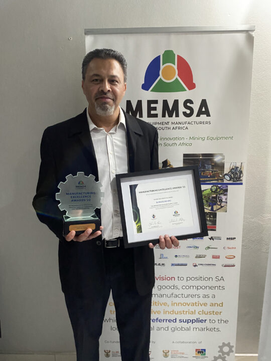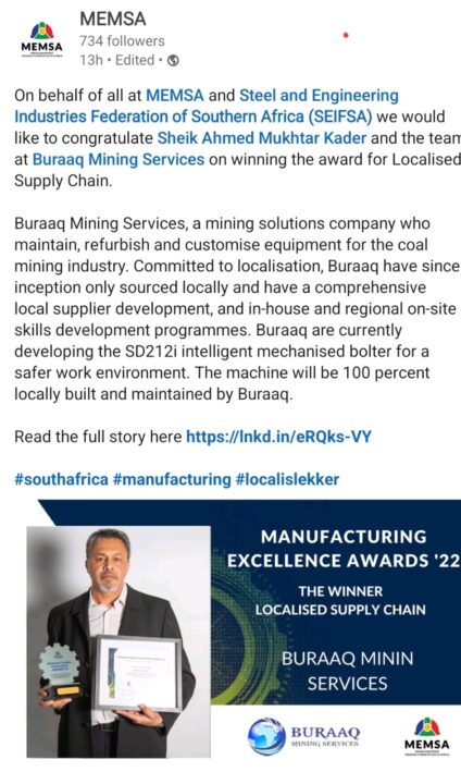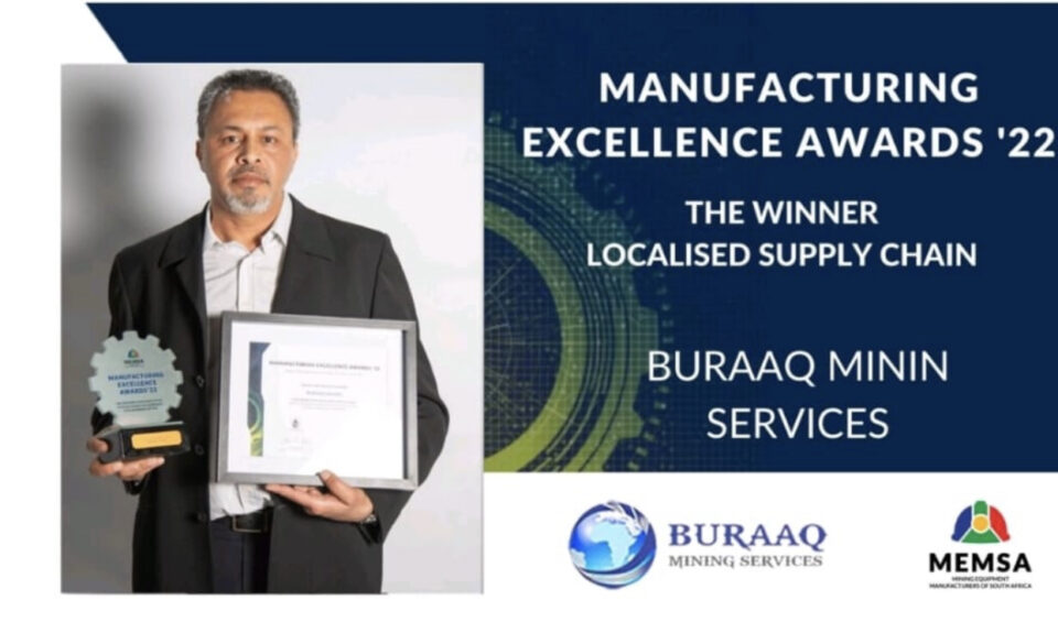 Buraaq Mining Services received an award for LOCALISED SUPPLY CHAIN which recognizes companies that contribute to developing the local supply chain through buying and manufacturing locally, collaborating with other South African Suppliers and manufacturers as well as reaching out a hand to mine communities.